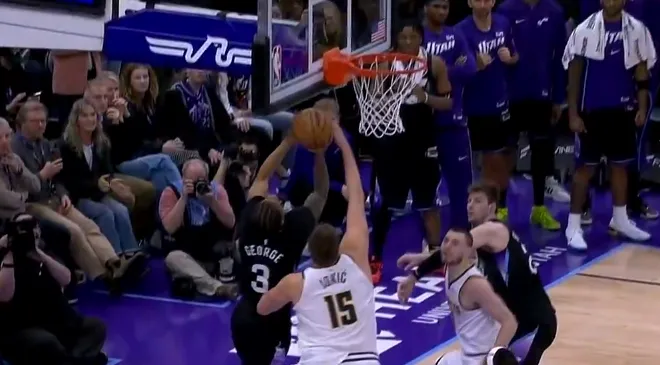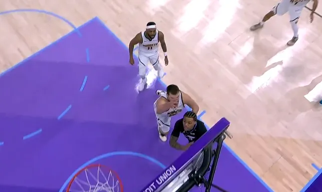 比赛的第四节,约基奇防守乔治上篮领到第六犯,掘金关键挑战成功。
